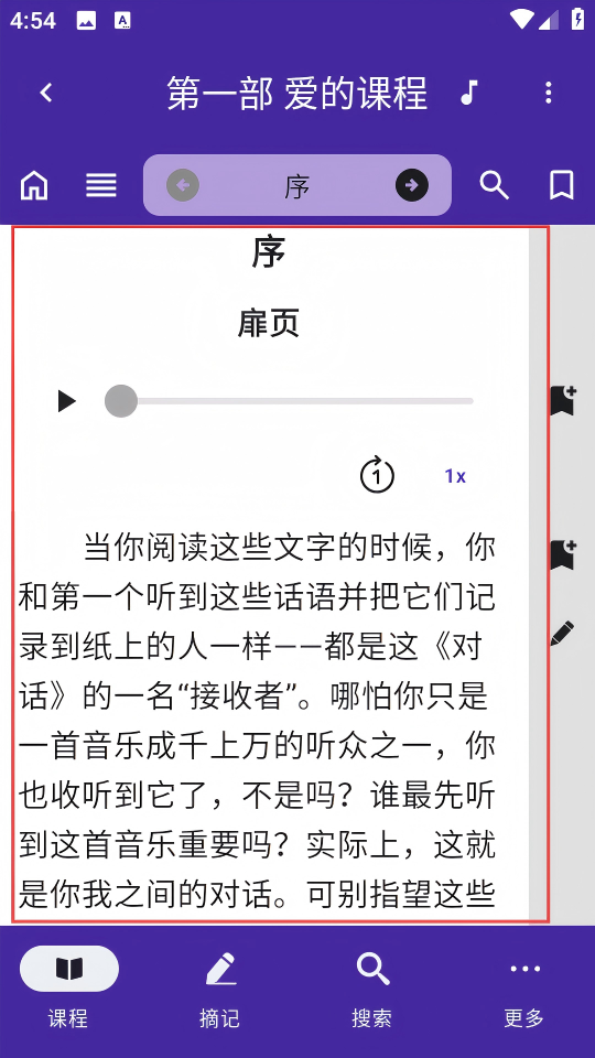 4、进入后,即可查看“扉页”的文字内容,还可进行播放等操作来辅助阅读。