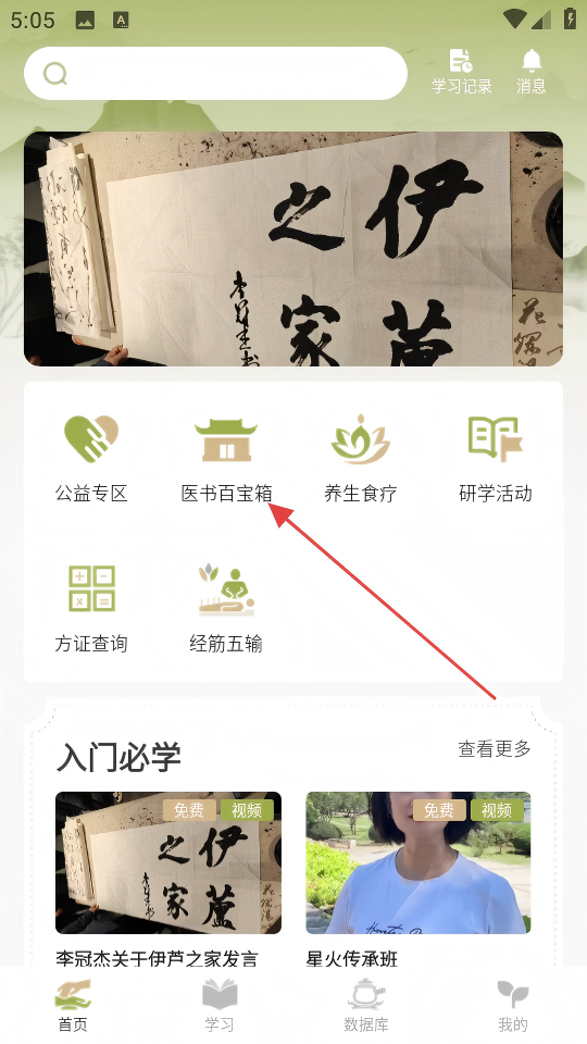 1、在APP首页,点击【医书百宝箱】,进入医书百宝箱页面。