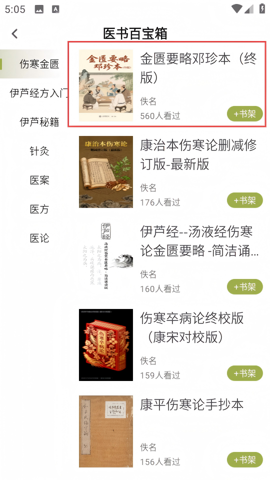 2、在医书百宝箱页面,选择要阅读的医书,进入该书的详情页面。