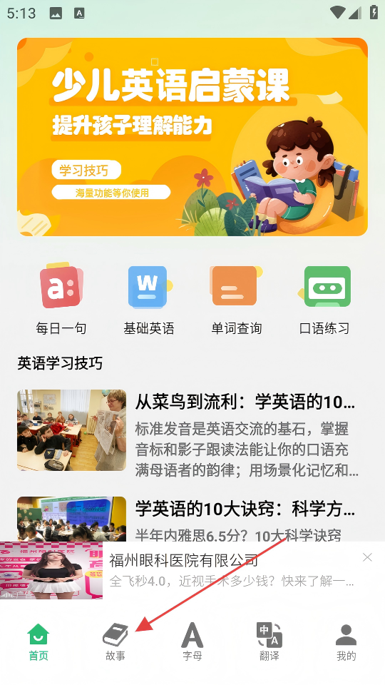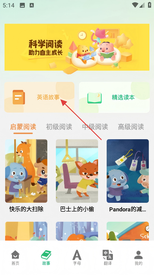 2、在故事页面,点击【英语故事】,进入英语故事列表页面。
