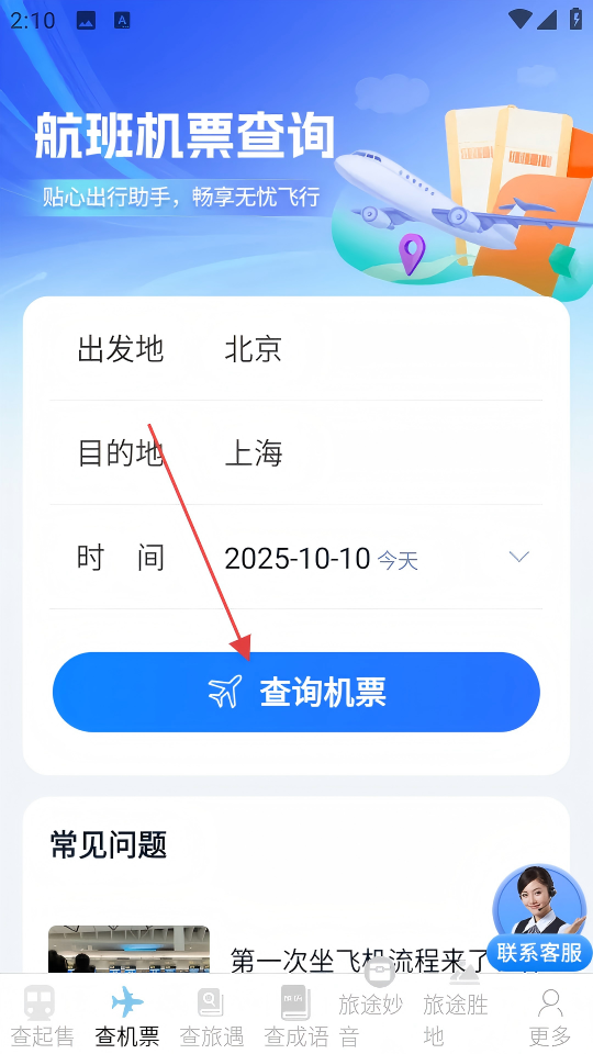 1、点击页面底部【查机票】,进入航班机票查询页面。