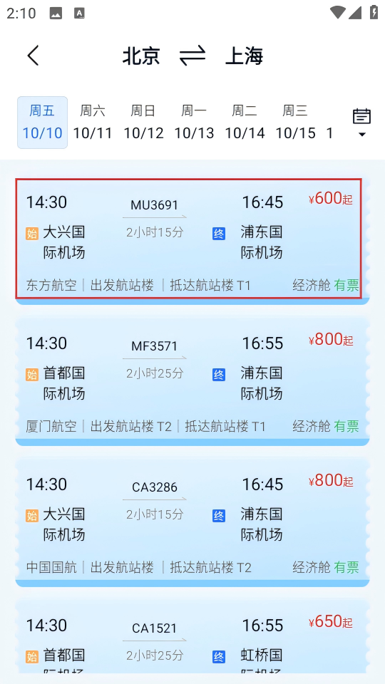 2、在航班机票查询页面,确认出发地、目的地、时间后,点击【查询机票】,进入航班列表页面。