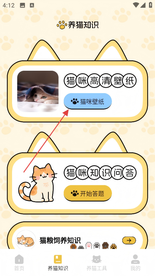 2、在养猫知识页面,点击【猫咪壁纸】,进入猫咪壁纸选择页。
