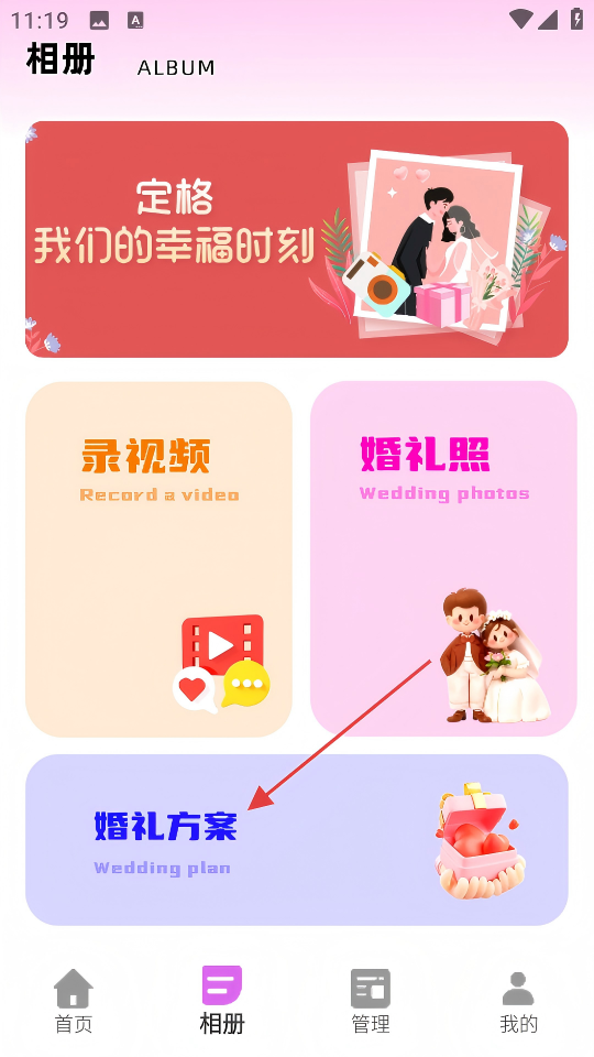 2、在相册页面,点击【婚礼方案】,进入婚礼预算相关页面。