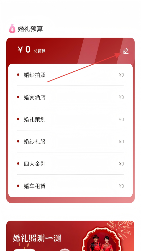 3、在婚礼预算页面,点击编辑图标,弹出婚礼预算编辑窗口。