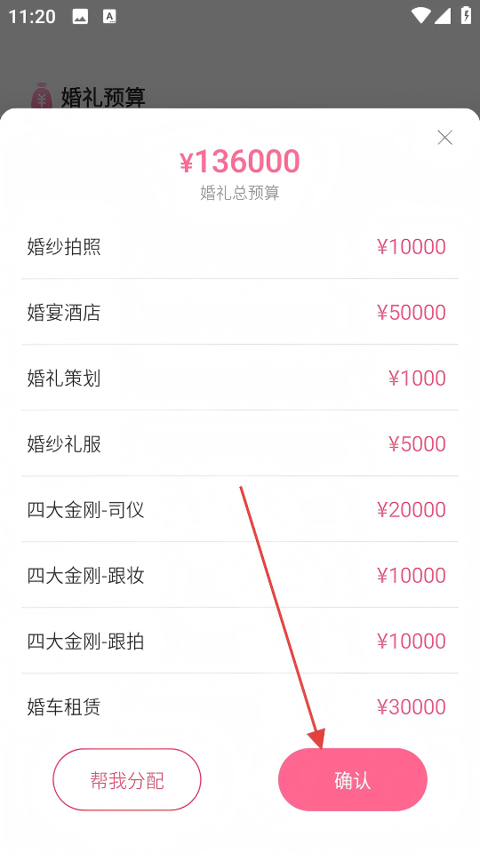 4、在编辑窗口设置各项预算金额后,点击【确认】,完成婚礼预算设置。