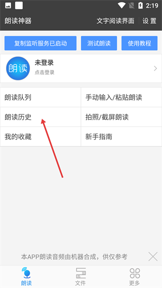 1、点击【朗读历史】选项,进入朗读记录管理页面。
