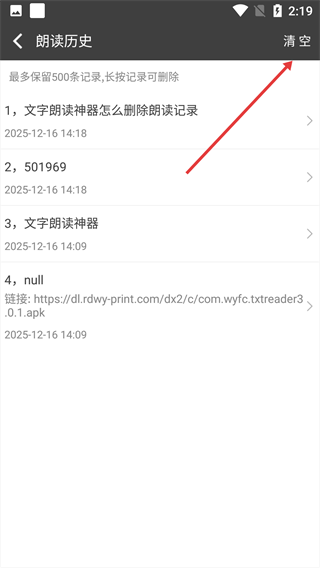 2、在朗读历史页面,点击右上角的【清空】按钮,弹出确认提示弹窗。