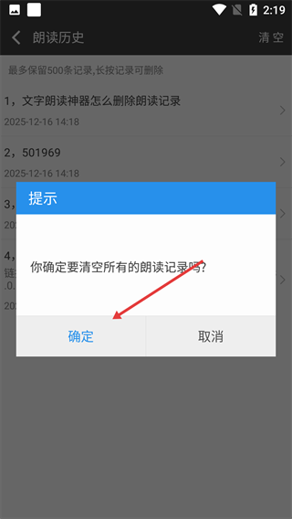 3、点击【确定】按钮,确认执行清空朗读记录的操作。