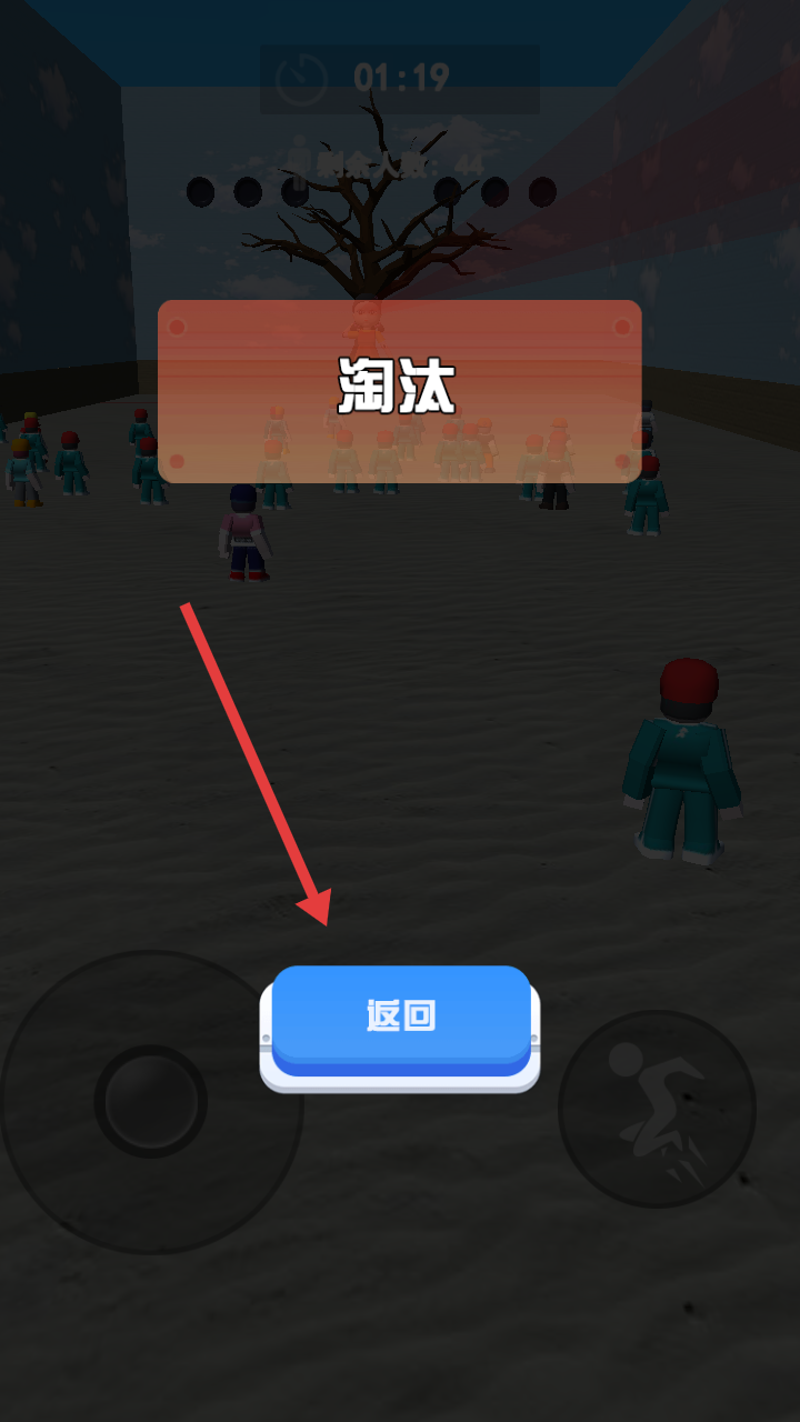 4、若被淘汰,点击返回按钮重新开始游戏,调整策略后再次尝试,争取在关卡中存活到最后。