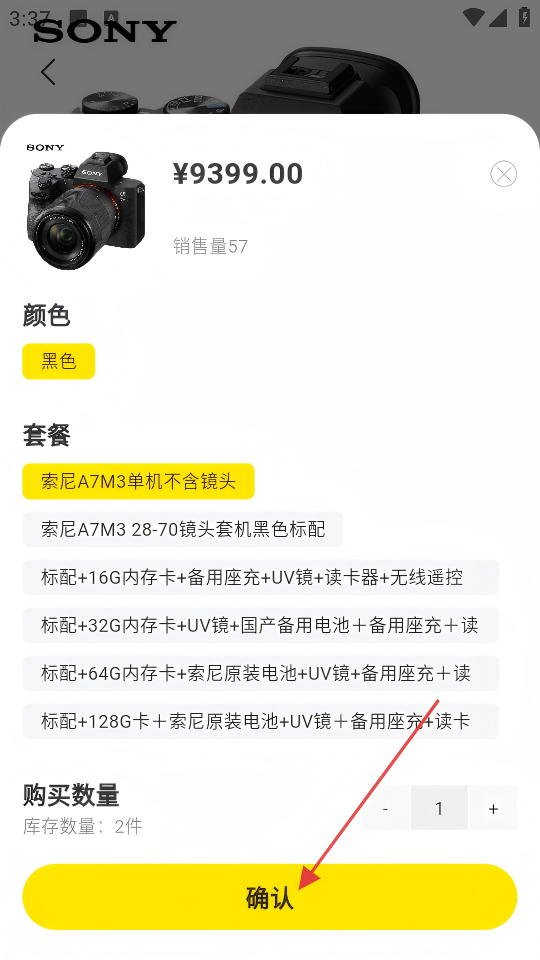 4、在规格选择页面,选择颜色、套餐、购买数量等信息后,点击【确认】,完成购买操作。