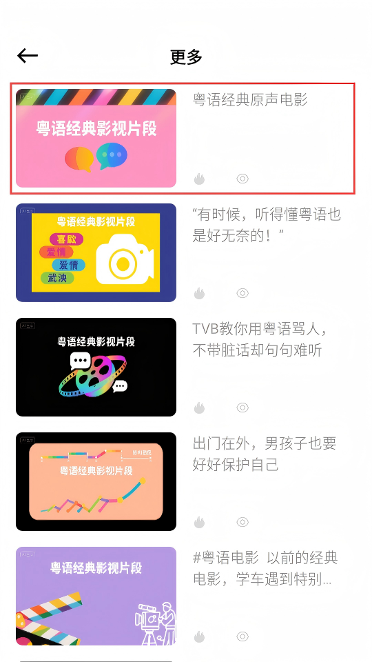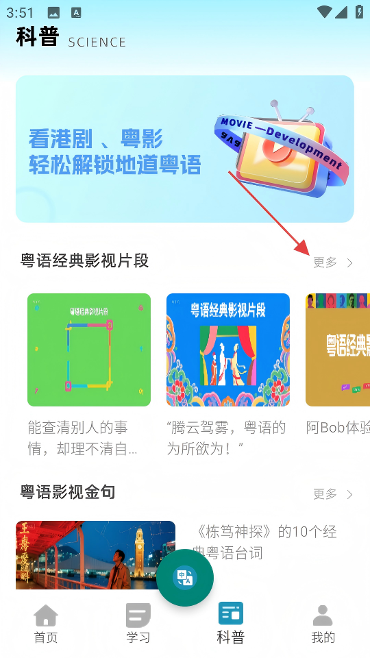 2、在科普页面,点击“粤语经典影视片段”右侧的【更多】,进入列表页面。