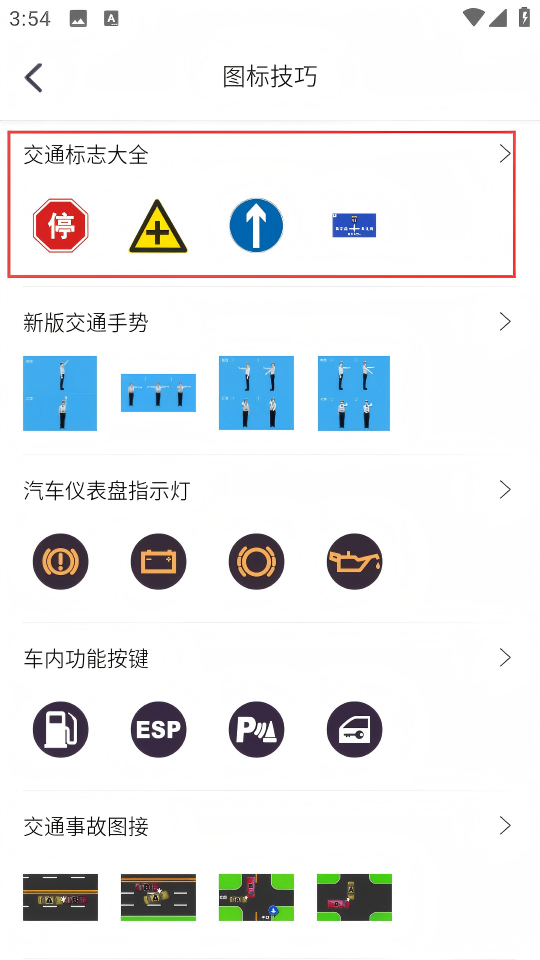 2、在图标技巧页面,点击【交通标志大全】,进入交通标志大全页面。