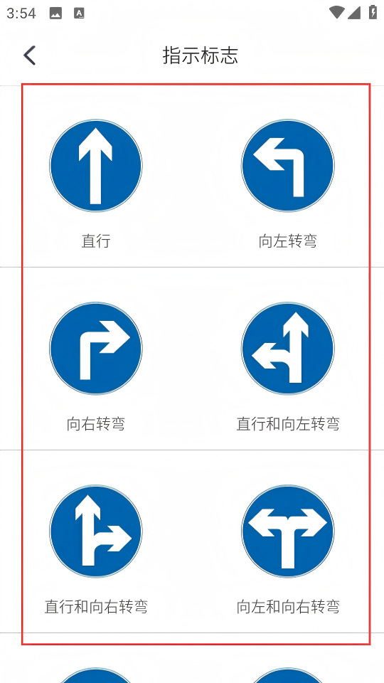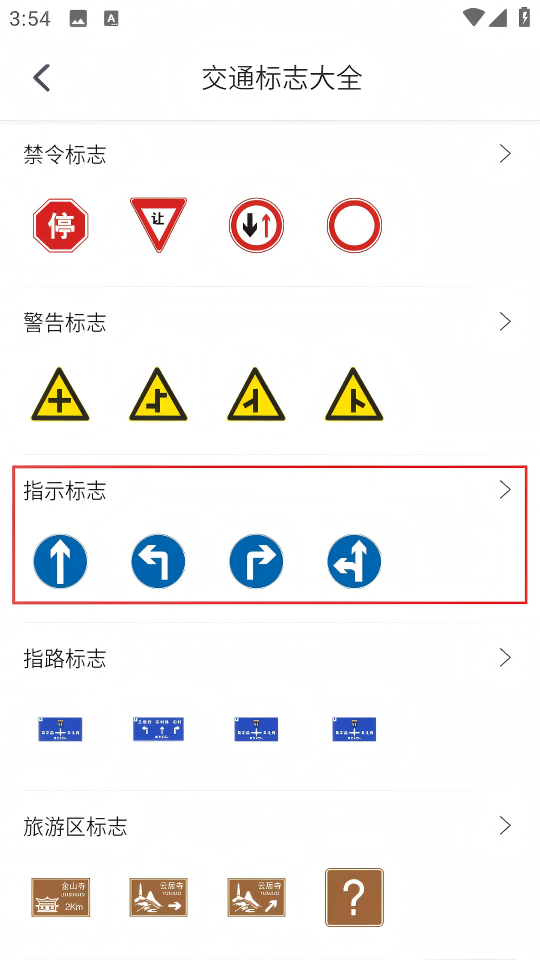 4、在指示标志页面,可查看各类指示标志的图形与含义。