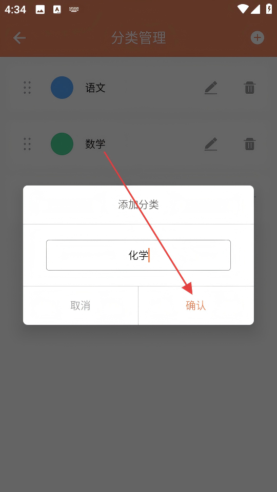 4、在添加分类窗口中输入学科名称,点击【确认】,完成分类添加。