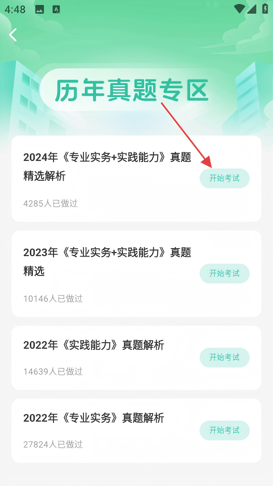 2、在历年真题专区,选择真题对应的【开始考试】,进入试题详情页。