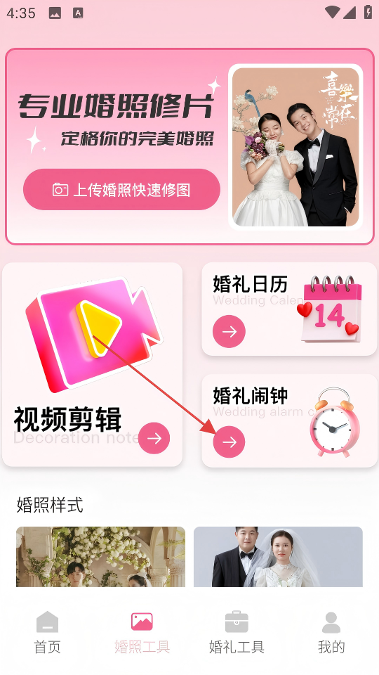 2、在婚照工具页面点击【婚礼闹钟】,进入闹钟页面。