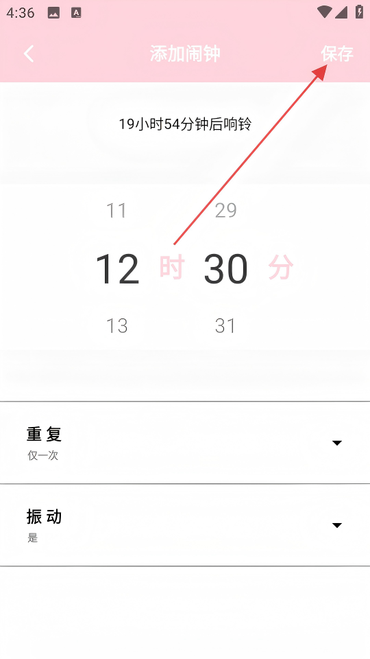 4、在添加闹钟界面设置时间等信息后,点击【保存】,完成婚礼闹钟的设置操作。