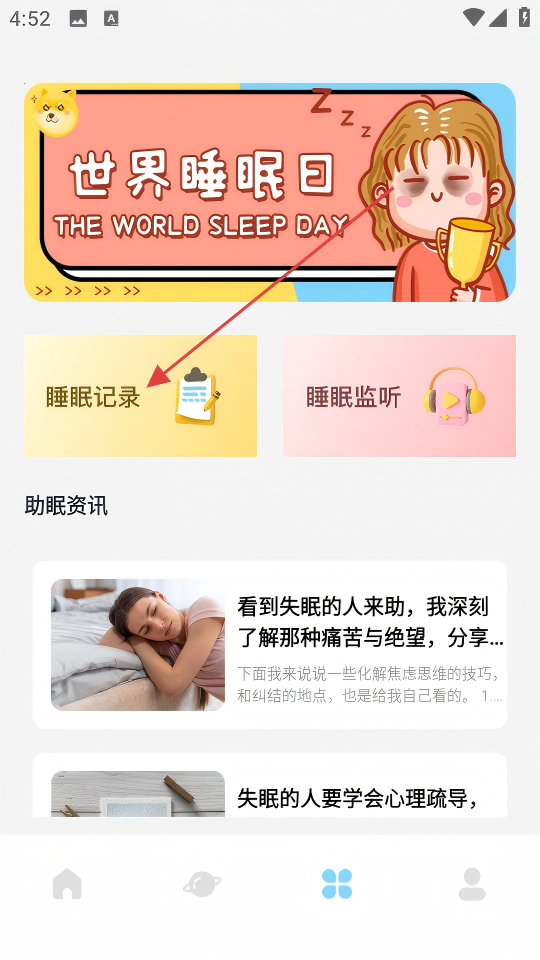 1、点击页面底部功能图标,进入含“世界睡眠日”板块的页面。