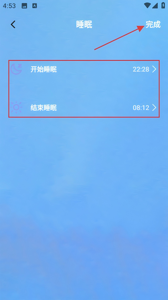 4、在睡眠记录添加页面设置好时间后,点击【完成】,完成睡眠记录的添加操作。