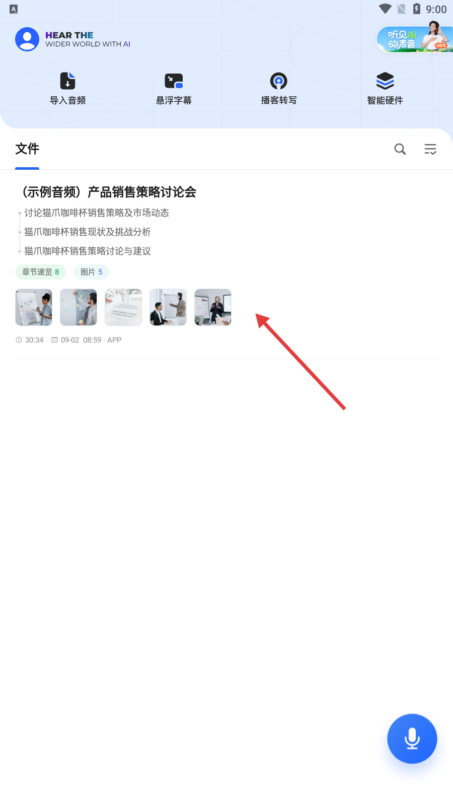 1、我们打开讯飞听见后,在文件列表里选择要处理的音频,比如【产品销售策略讨论会】,就能进入音频详情页啦。