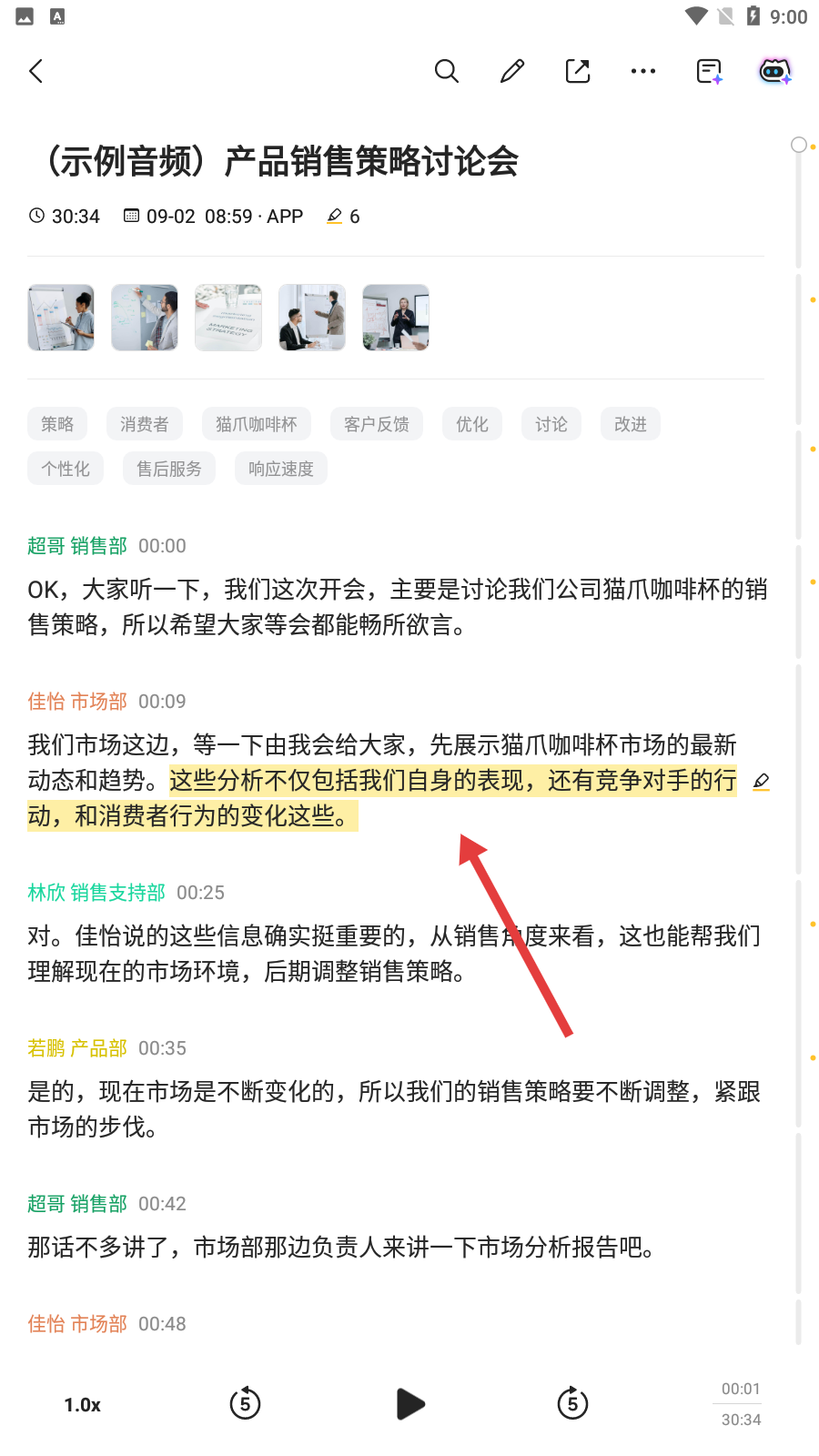 2、进入音频详情页后,我们可以查看音频的转写文字,还能看到不同发言者的内容,方便了解音频信息哦。