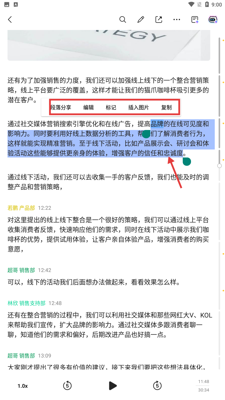 4、我们选中需要的文字后,会弹出操作栏,能进行【段落分享】、【编辑】、【标记】等操作,方便对文字进行处理呢。