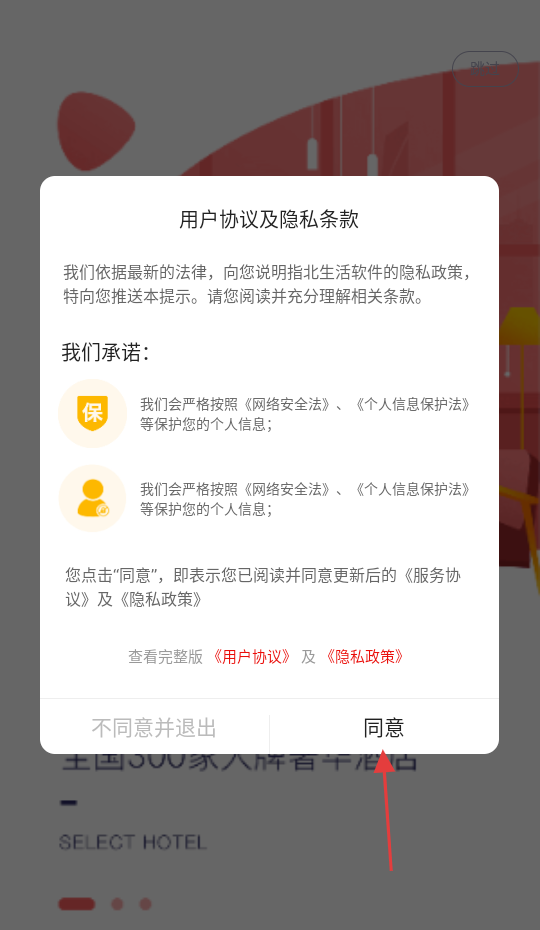 1、点击【同意】接受用户协议及隐私条款。