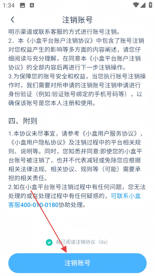 4、在注销账号协议阅读页面,点击【注销账号】,完成账号注销操作。