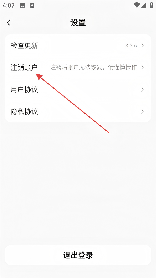3、在设置页面点击【注销账户】,进入注销协议阅读页面。