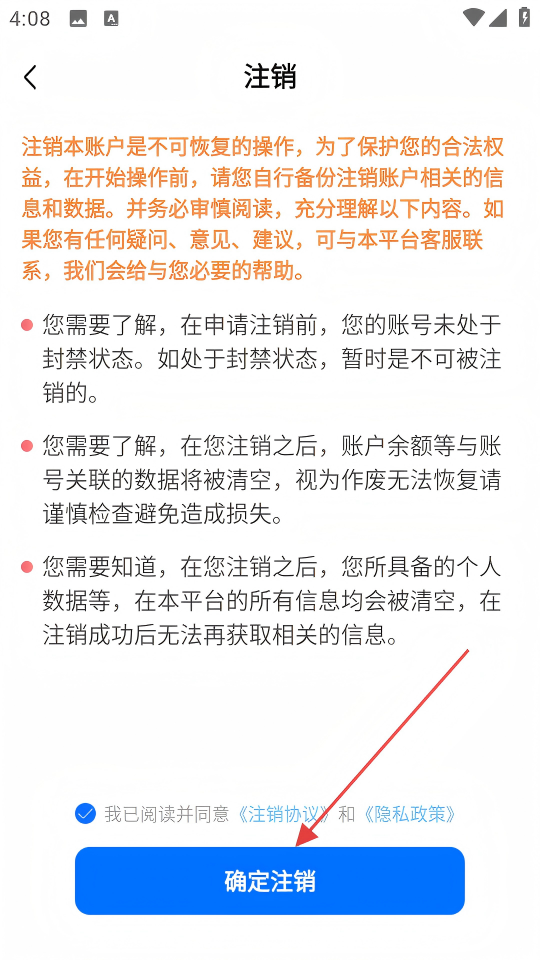 4、在注销协议阅读页面,点击【确定注销】,完成账号注销操作。