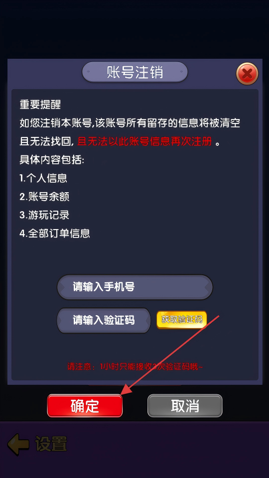 4、在账号注销提醒页面,输入手机号和验证码后,点击【确定】,完成账号注销操作。