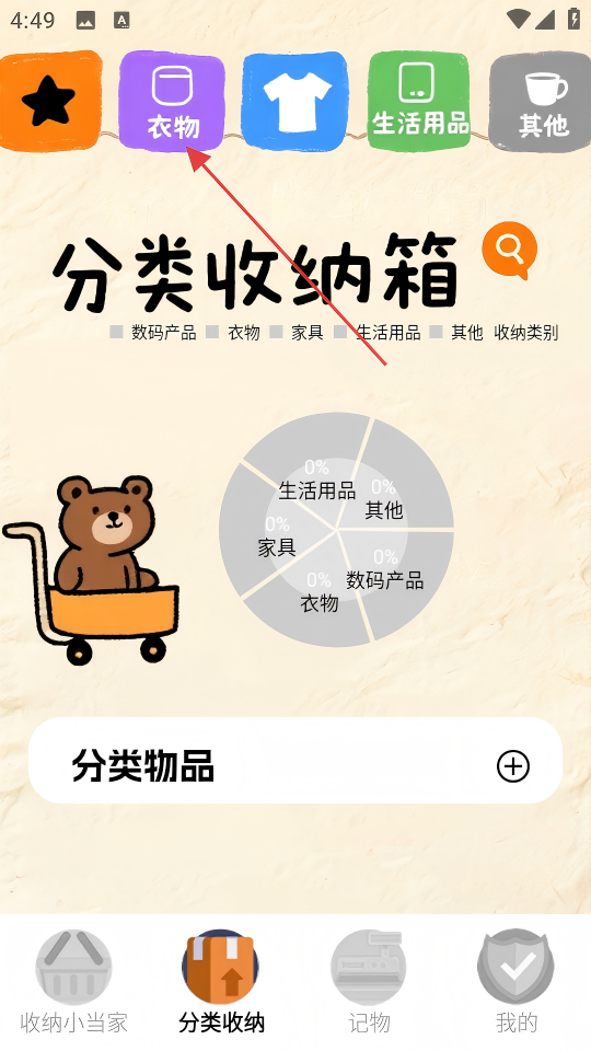2、在分类收纳页面点击【衣物】分类,进入衣物收纳管理页面。