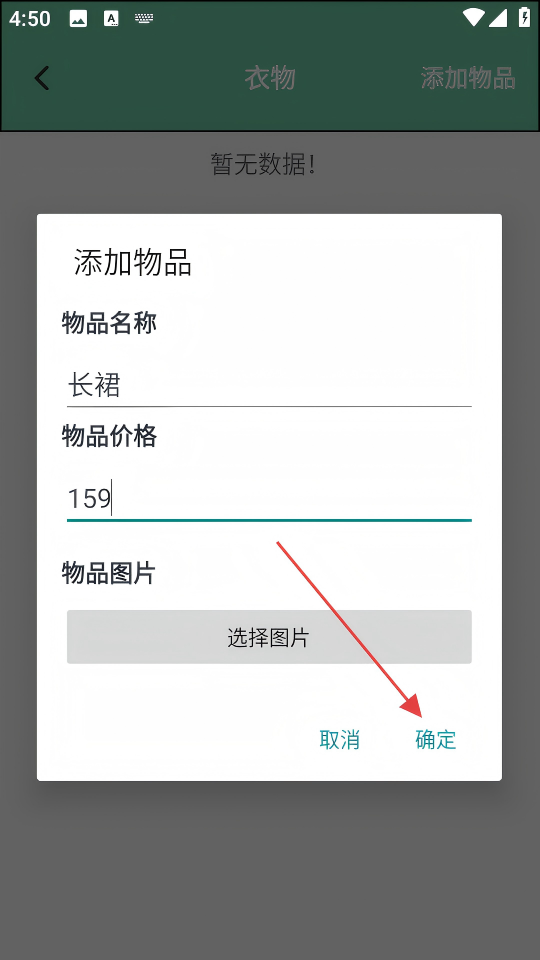 4、输入物品名称、物品价格,点击【确定】,完成衣物类物品的添加操作。