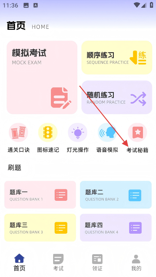 2、在首页点击【考试秘籍】,进入秘籍宝典页面。