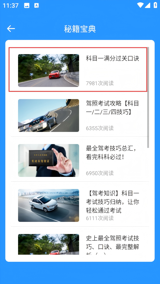 3、在秘籍宝典页面点击【科目一满分过关口诀】,进入该口诀的详情页面。
