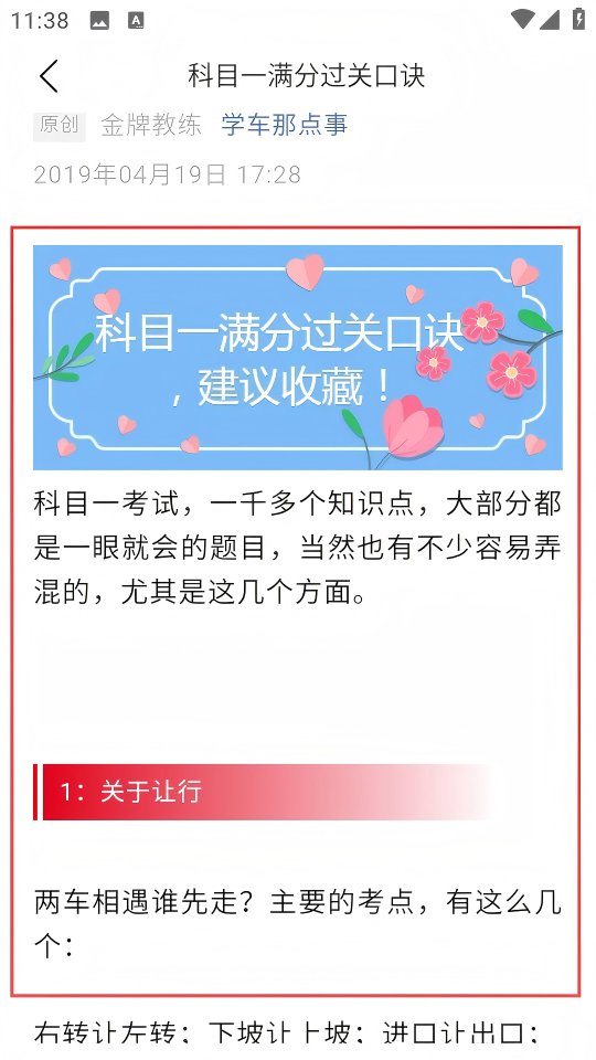 4、在科目一满分过关口诀详情页面,查看关于让行等考点的口诀内容。