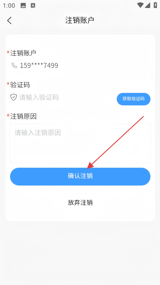 4、在注销账户页面输入验证码、注销原因后,点击【确认注销】,完成账户注销操作。