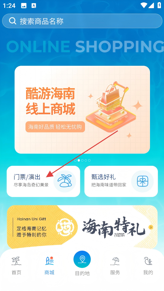 2、在商城页面点击【门票/演出】,进入门票分类页面。