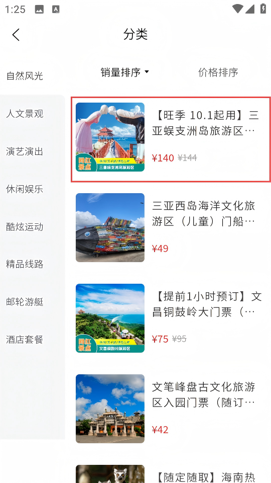 3、在门票分类页面选择目标景区门票,进入该门票的商品详情页面。