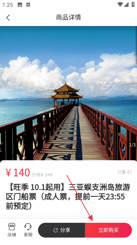 4、在商品详情页面点击【立即购买】,完成景区门票的购买操作。