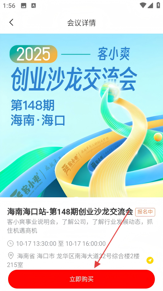 2、在营销中心页面选择【海南海口站-第148期创业沙龙交流会】,进入该会议的详情页面。