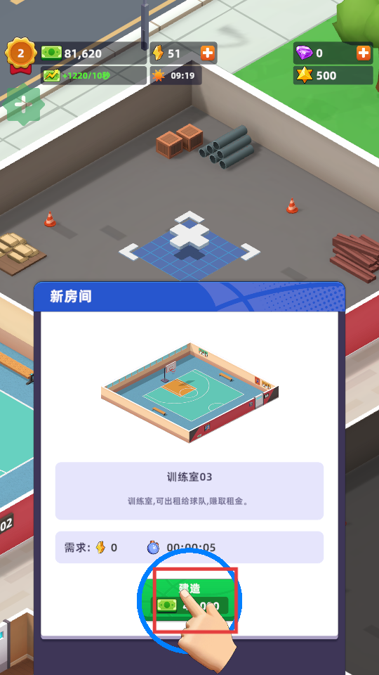 4、点击【建造】,花费资金建造训练室03,扩展篮球馆规模,提升运营能力。