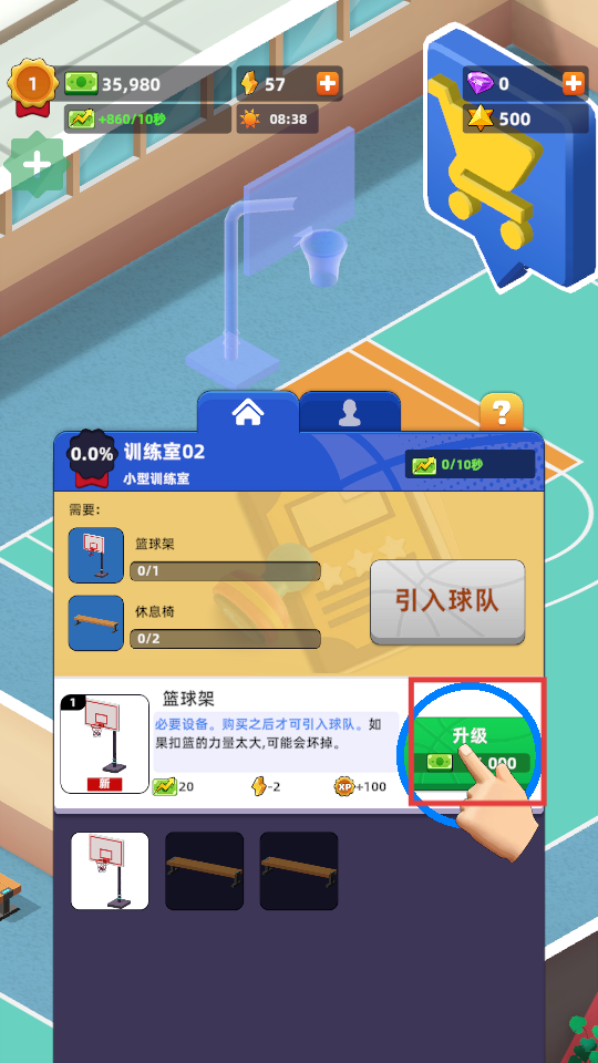 2、点击【升级】篮球架,建设训练室02的必要设施,为引入球队创造条件。