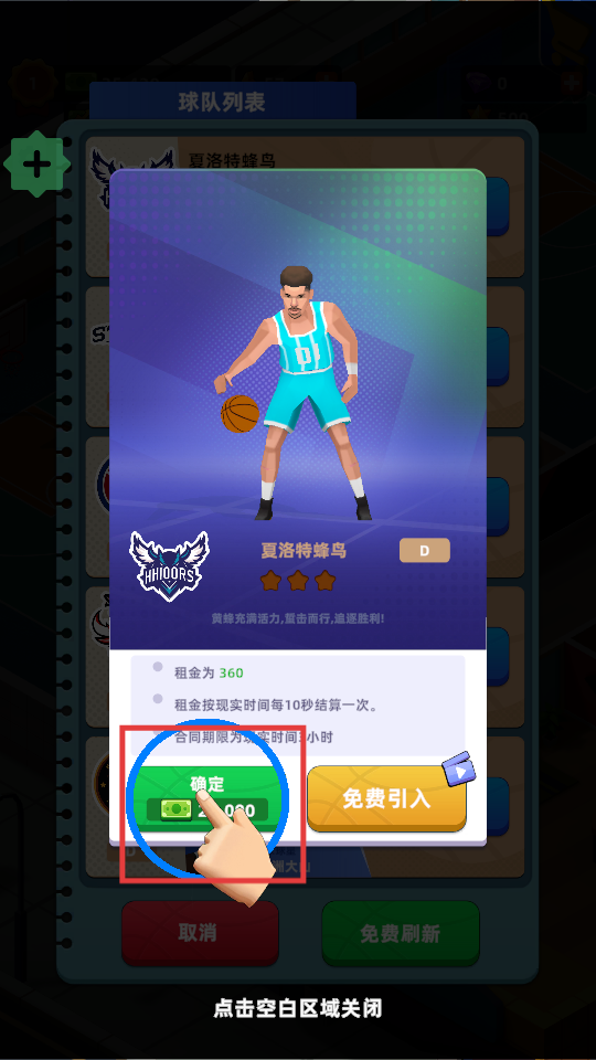 1、点击【确定】,花费资金引入夏洛特蜂鸟队,提升球队实力,推进篮球馆发展。