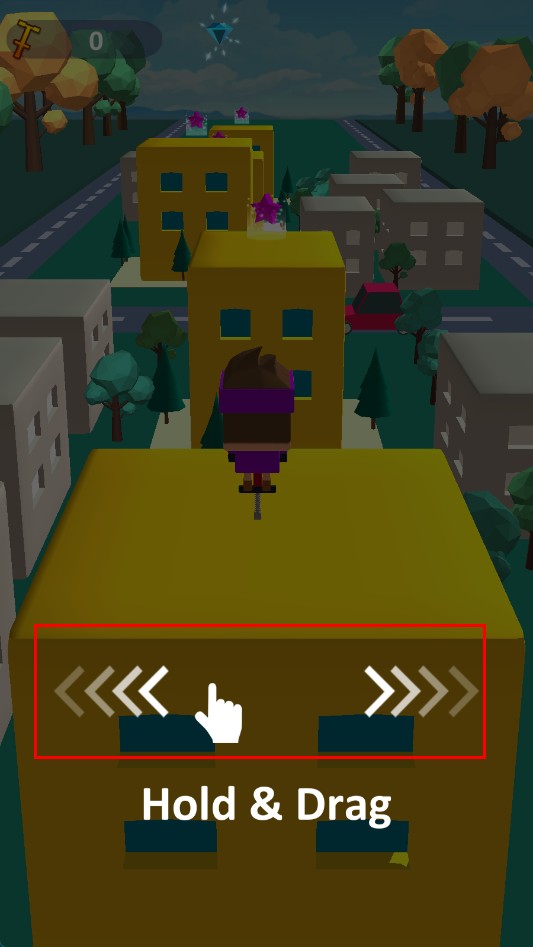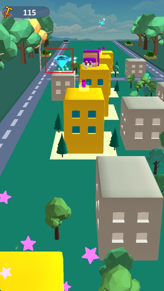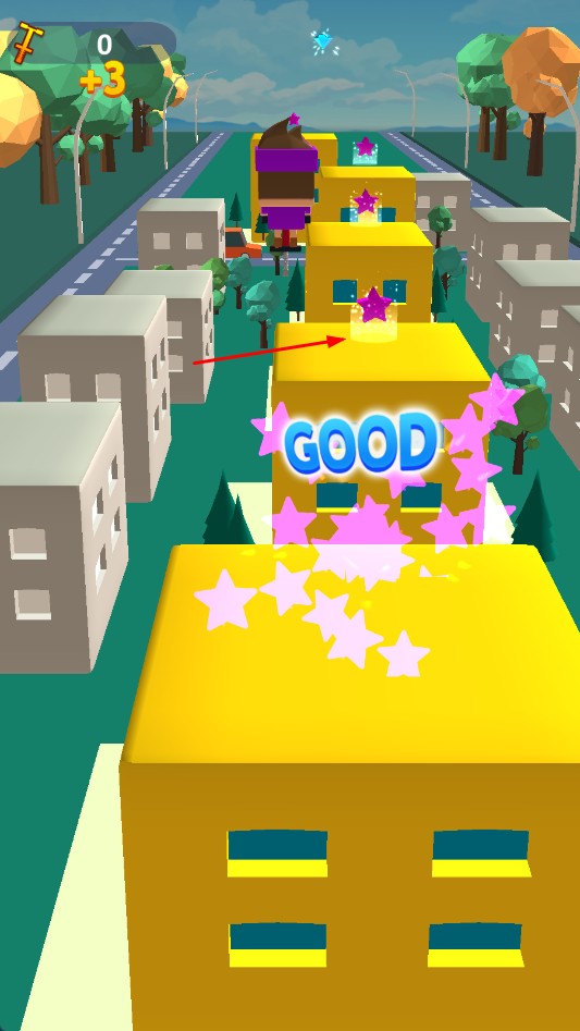 2、引导角色跳在黄色房子建筑上并收集紫色星星道具。