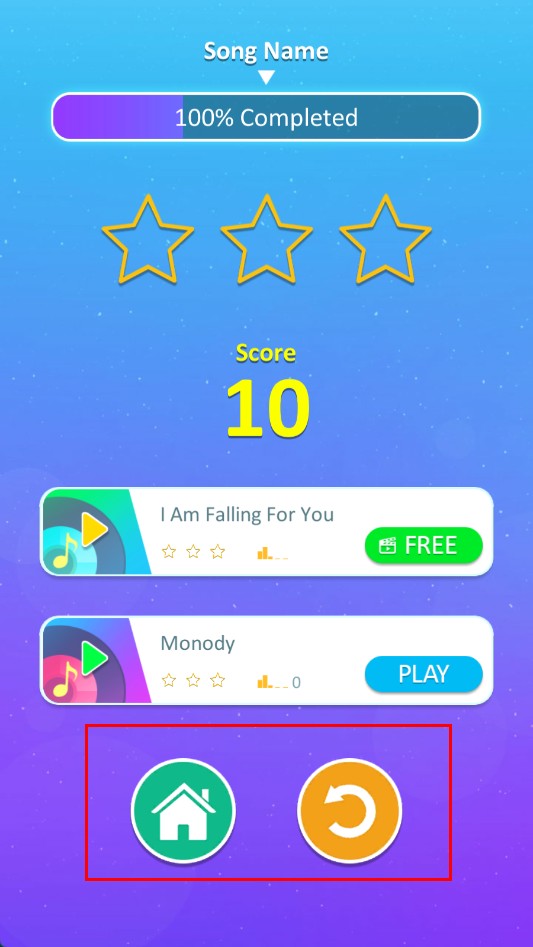 4、关卡结束后,界面会显示完成度、评分等,可点击房子图标返回主页或箭头图标重新开始。