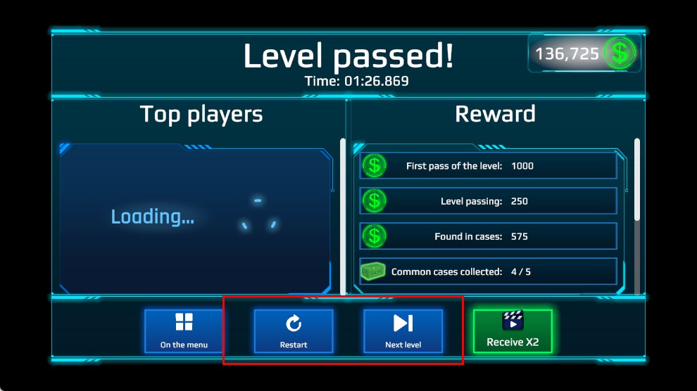 4、关卡通过后,可选择【Restart-重新开始】或【Nextlevel-下一关】继续游戏。