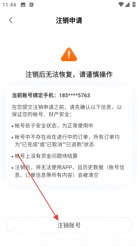 4、在注销申请页面确认账号状态等信息后,点击【注销账号】,完成账号注销操作。