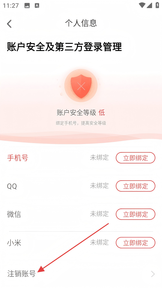 4、在个人信息页面,点击【注销账号】选项,可进行账号注销操作。